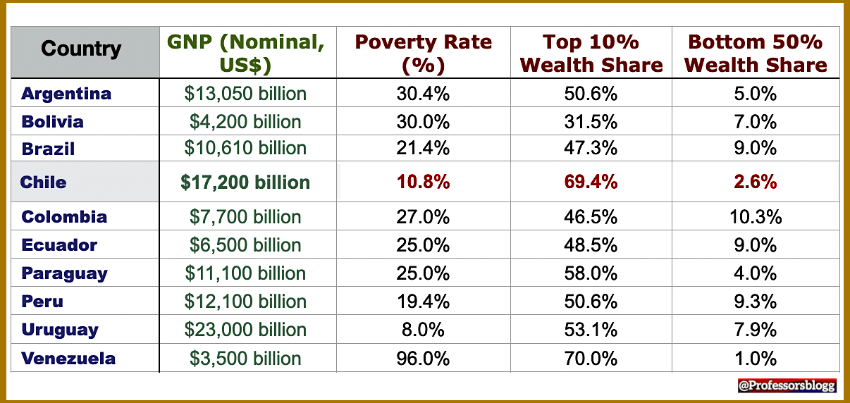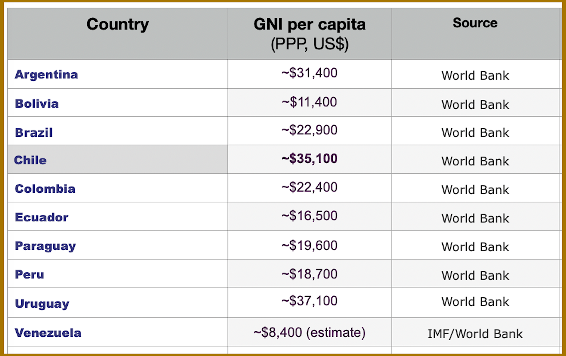 Across Latin America, the wealthiest 10% of the population holds 57% of the economic resources, while the poorest 50% have access to only 8% of the total ––according to the World Inequalities Lab (WIL) of December 2025. [5] The table below shows the GNI per capita of Chike and otheres countries of South America.