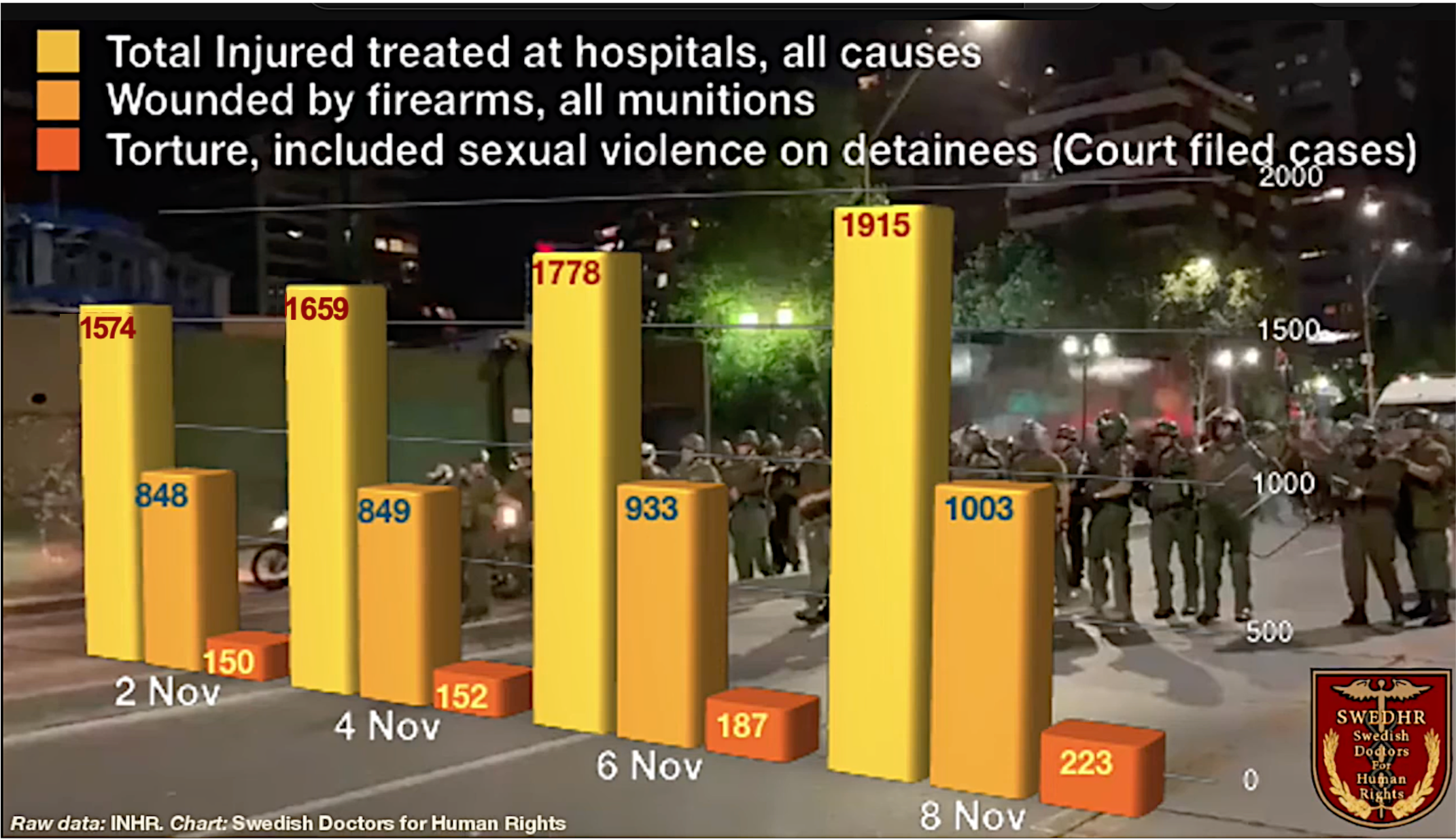 In a comprehensive four-year assessment, the National Institute for Human Rights (INDH) reported that 3,581 individuals experienced physical injuries as a result of the unrest. The INDH also registered thousands of legal actions concerning human rights violations, including instances of unlawful coercion, torture, and unnecessary violence. According to the INDH, 3400 civilians were hospitalized between October 17 – December 6, following the protest repression.[22]