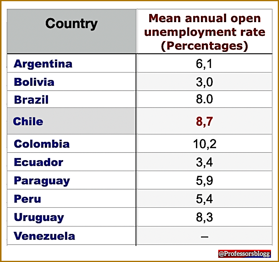 In sum, in Chile ––the second largest economy in South America in terms of GNP (Nominal, US$)– and despite having a very low poverty rate (second lowest), the top 10 percent share 69,4 % of the wealth, while the bottom fifty percent share only the 2,6 %. Being this the lowest share for the poor, after the Venezuelans’. And Chile’s mean annual unemployment rate is the second highest among South American nations: