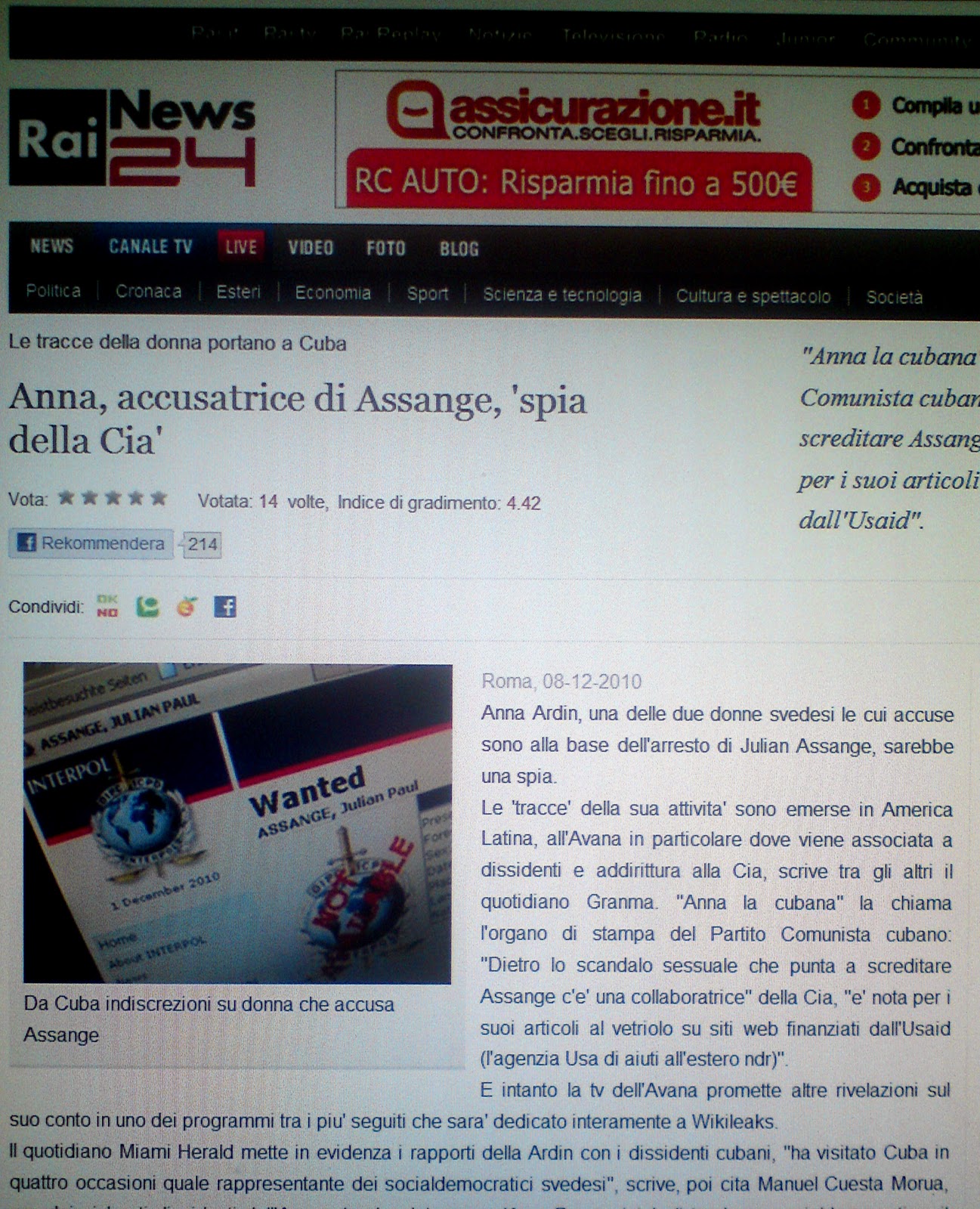 Breaking news from the Italian News Agency RAI News-24 and the Cuban Prensa Latina – and that, needles to say, will not be accounted by the Swedish media – provide now extensive details on the alleged CIA connection of a “Cuban woman” of name “Anna Ardin”, and of her activities in Cuba and Sweden. She is also signaled in those news reports as one of the two women behind the accusations against Julian Assange. The RAI article has the headline “Anna, accusatrice di Assange, ‘spia della Cia’