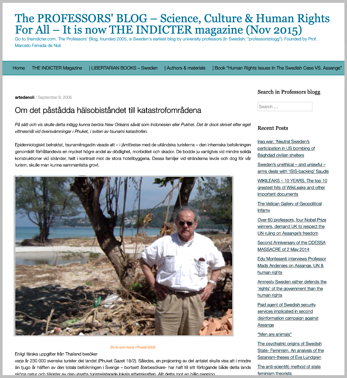 Below is a screenshot from Professorsblogg Vol. I, September 2005, published September 8, 2005. It references my research visit to Phuket during the tsunami that devastated the region. My participation there corresponded to an international injury-epidemiological project I initiated at the Department of Social Medicine at the Karolinska Institute, while I was professor there.