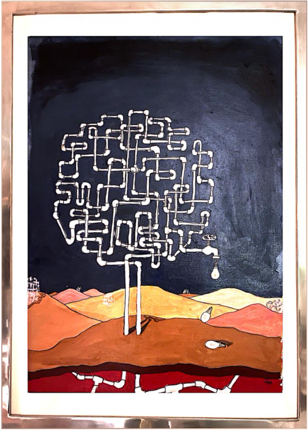 Depicted at the centre of the painting is a ‘creative tree’. Inventions seems to flow as fruits –represented by bulbs falling onto the ground, destined to light up, and eventually serve as nutrient to the soil from they were born. However, the tree itself receives its nourishment from the production of other discovery trees scattered across the world. All trees are connected by a common earth and its underlying intricate system of reciprocal communications.